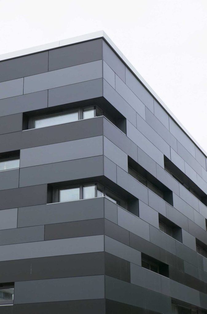 Trespa es un laminado de alta presión decorativo para aplicaciones exteriores. Los paneles están constituidos por capas de fibras de madera (papel kraft) impregnadas con resinas orgánicas. Las resinas que recubren las capas superficiales son curadas mediante la tecnología «Electron Beam Curing (EBC), única de Trespa, a fin de mejorar las propiedades de protección contra la intemperie y la luz, creando un material homogéneo no poroso de mayor densidad y con una superficie decorativa integrada. Los paneles Trespa son retardantes al fuego y tienen la opción de contar con certificado PEFC/FSC.
